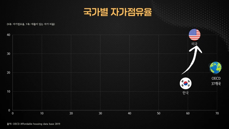 자가 점유율과 대출이 있는 자가 비율을 나타내는 아래 그래프를 보면 미국의 자가점유율은 62%로 한국의 59%보다 높습니다. 특히 주목해야 할 점은 미국에서 주택을 소유한 사람들 중 대출을 받은 비율이 40%에 달하며, 이는 OECD 37개국 평균과 한국보다 월등히 높습니다.