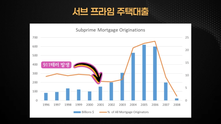 미국 주택시장과 서브프라임 모기지 시장은 2000년대 초반부터 활성화되기 시작했습니다. 특히 2001년 9월 11일 테러 공격 이후, 경제 활성화를 위해 미국 연방준비제도가 금리를 대폭 인하함에 따라 저렴한 대출이 증가했습니다. 이 기간 동안 주택 가격이 상승하면서 많은 사람들이 투자 목적으로 주택 시장에 진입했고, 이는 서브프라임 모기지에 대한 수요를 크게 증가시켰습니다.