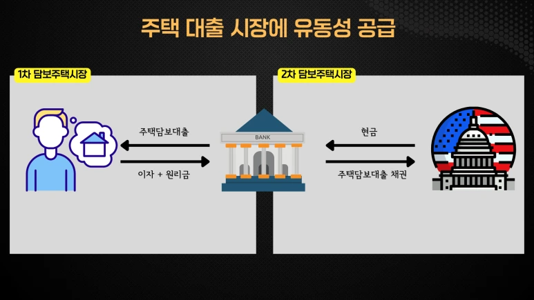 이 문제를 해결하기 위해, 은행의 주택 담보대출 채권을 누군가 매입하여 은행에 현금을 공급하면 은행은 더 많은 주택 담보대출을 할 수 있게 됩니다. 미국에서 이러한 역할을 하는 기관이 바로 패니 메이입니다. 2차 담보주택시장에서 은행으로부터 주택 담보대출 채권을 매입하고 은행에 현금을 공급함으로써 은행의 유동성을 높이는 중요한 역할을 합니다. 이를 통해 더 많은 사람들이 주택을 소유할 수 있습니다.