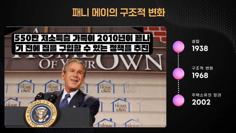 이러한 변화는 패니 메이가 주택 담보대출 시장에서 중요한 역할을 수행하면서 미국 정부의 직접적인 재정적 부담을 줄이는 데 큰 도움을 주었습니다. 패니 메이는 2002년에도 큰 변화를 기록했습니다. 부시 대통령은 "A home of your own" 정책을 통해 안정된 미국을 이루기 위한 방편으로 주택 소유를 장려하고, 패니 메이가 중추적인 역할을 맡았습니다.