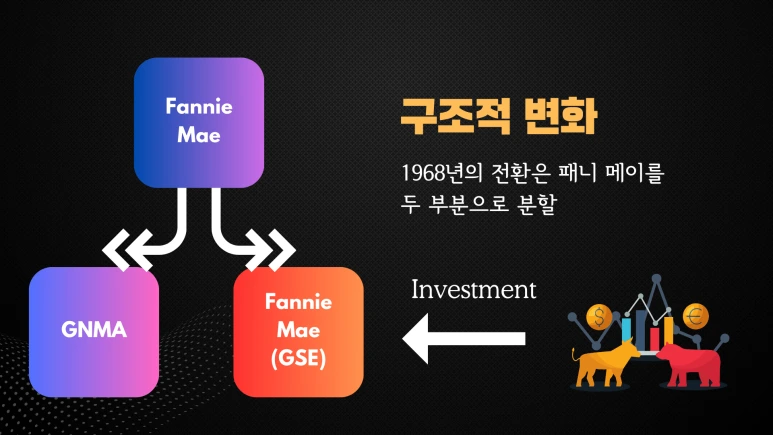 1968년에는 패니 메이가 중대한 변화를 겪으며 정부 기관에서 정부 후원 기업(Government-Sponsored Enterprise, GSE)으로 전환되었습니다. 이 전환은 미국 정부의 재정 부담을 줄이고, 패니 메이를 더 시장 지향적으로 만들기 위한 것이었습니다. 이 과정에서 패니 메이는 지니 메이(Government National Mortgage Association, GNMA)와 분할되었으며, 지니 메이는 여전히 정부 기관으로 남아 있습니다.