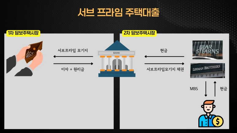 이 시기 동안 베어 스턴스와 리만 브라더스 같은 투자은행들은 더 큰 수익을 위해 더 위험한 서브프라임 주택 담보대출을 매입하여 투자자들에게 판매했습니다.