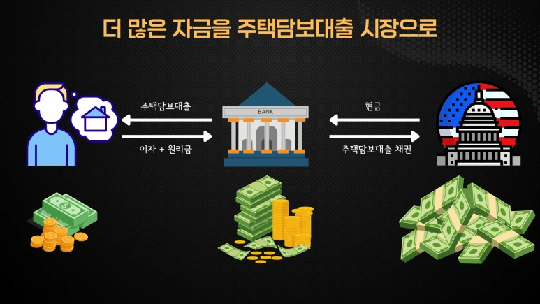 자본을 낮게 조달할 수 있는 패니 메이는 은행들이 소유한 수백억 달러의 주택 담보대출 채권을 구입함으로써 금융 기관의 현금흐름을 증가시키고, 더 많은 자금이 주택 담보대출 시장으로 흘러 들어갈 수 있게 장려했습니다.