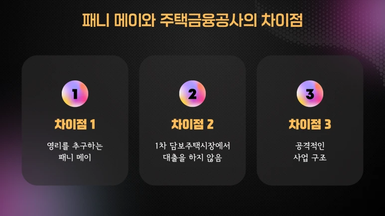 패니 메이와 주택금융공사는 몇 가지 중요한 차이점이 있습니다: