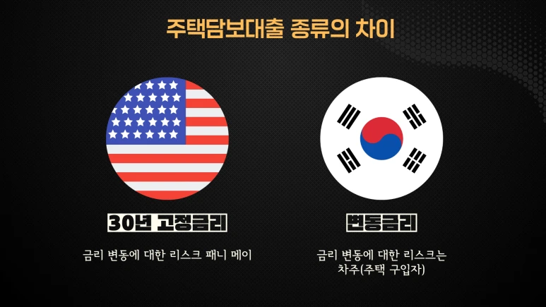 반면, 한국을 비롯한 대부분의 나라에서는 주택 보유자들이 변동금리로 대출을 받습니다. 이로 인해 금리 변동에 대한 리스크는 주택 구입자가 직접 부담하게 됩니다. 전 세계적으로 30년 고정 금리로 대출을 제공하는 나라는 단 두 국가뿐이며, 그중 하나는 미국입니다.