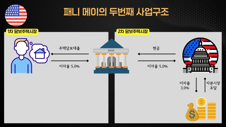 두 번째 사업은 첫 번째 방법보다 훨씬 공격적인 이익 추구 방법입니다. 패니 메이는 정부의 보증을 바탕으로 시장에서 낮은 금리로 자본을 조달할 수 있으며, 이를 통해 얻은 자본을 활용하여 더 큰 이익을 창출합니다. 패니 메이는 은행으로부터 매입한 주택 담보대출 채권을 통해 이익을 얻는 구조를 가지고 있습니다. 이는 패니 메이의 낮은 자본 비용과 은행의 주택 담보대출 채권 간의 금리 차이 덕분입니다. 예를 들어, 패니 메이의 조달 금리가 3%이고 은행의 주택 담보대출 채권 금리가 5%인 경우, 대출 채권 원금에서 2%의 이익을 올릴 수 있습니다.