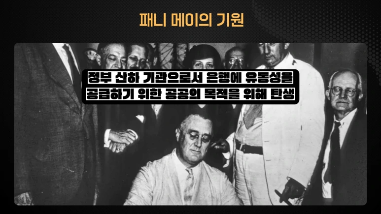 패니 메이의 공식적인 이름은 Federal National Mortgage Association, 줄여서 FNMA입니다. 이 기관의 기원은 루스벨트 대통령의 뉴딜 정책에 있으며, 1938년 대공황 동안 주택 대출 시장에 유동성을 제공하여 경제에 활력을 불어넣기 위해 설립되었습니다. 초기에는 정부 산하 기관으로서 은행에 유동성을 공급하기 위한 공공의 목적으로 탄생했습니다.