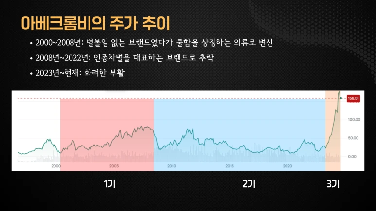 아베크롬비의 최근 1년간 성장률은 엔비디아 능가합니다. 지난 20년 동안의 아베크롬비의 주가를 보면 롤러코스터를 연상케 하는데요. 아베크롬비는 크게 3기로 구분해 볼 수 있습니다.
