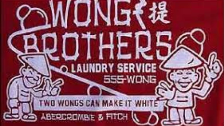 "황 형제 세탁 서비스 – 두 명의 황이 하얗게 만들 수 있다"라는 뜻으로, 아시아인들은 세탁업에 종사하는 사람들로 고정하고, 인종 차별적이며 모욕적인 고정관념을 강화하는 문구라고 볼 수 있죠?
