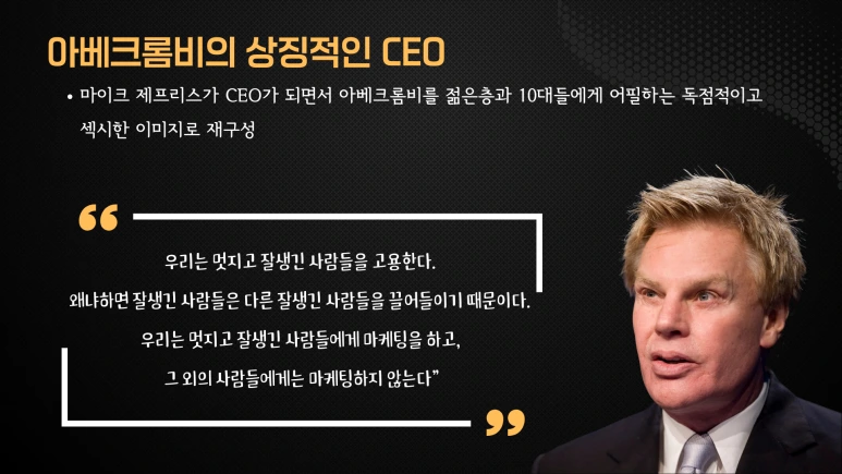 2000년 마이크 제프리스가 CEO가 되면서 아베크롬비를 젊은 층과 10대들에게 어필하는 독점적이고 섹시한 이미지로 재 브랜딩 했습니다. 마이크 제프리스는 여러 망언을 했습니다.