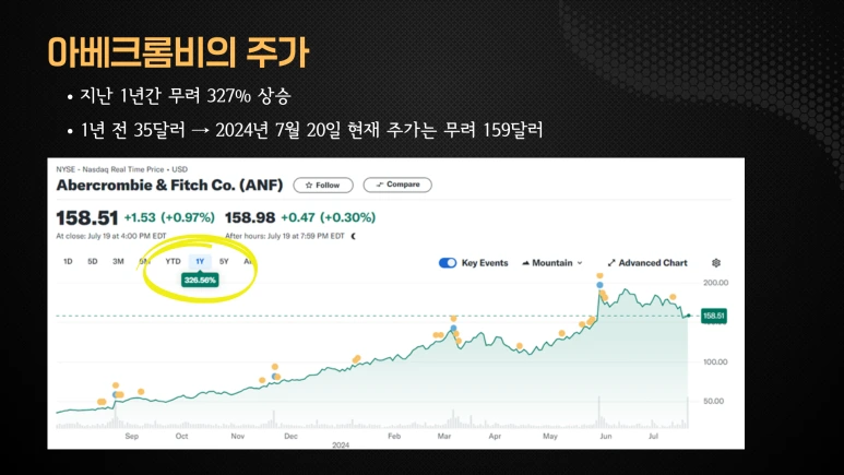 젊음과 쿨함을 상징하는 브랜드에서 바닥을 찍고 다시 부활한 아베크롬비에 대해 알아보겠습니다. 아베크롬비의 주가는 지난 1년간 무려 327% 상승했습니다. 1년 전 35달러여서 2024년 7월 20일 현재 주가는 무려 159달러입니다.