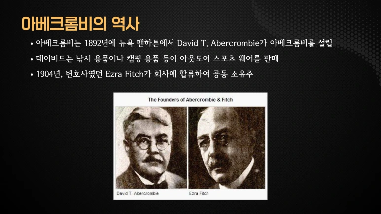 아베크롬비는 1892년에 뉴욕 맨해튼에서 David T. Abercrombie에 의해 설립되었습니다. 데이비드는 낚시 용품이나 캠핑 용품 등 아웃도어 스포츠 웨어를 판매했습니다. 1904년, 변호사였던 Ezra Fitch가 회사에 합류하여 공동 소유주가 되었고, 회사 이름은 Abercrombie & Fitch로 변경되었습니다.