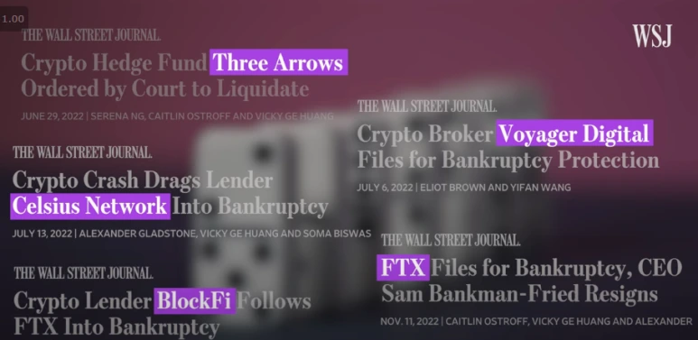 암호화폐 생태계는 상황이 좋을 때는 효율적인 시스템으로 보이지만, 위기 상황에서는 더 큰 위험을 전파시킵니다. Voyager는 2022년 7월 파산 신청을 했습니다. 며칠 후 Celsius도 파산했고 FTX는 2022년 11월 자금 관리 부실로 파산 신청을 했습니다. FTX 파산 이후 암호화폐 대출업체인 BlockFi는 인출을 중단하고 결국 파산했습니다. BlockFi는 FTX의 자매 회사인 Alameda에 대여했지만 대여금이 회수되지 않아 결국 무너졌습니다.
