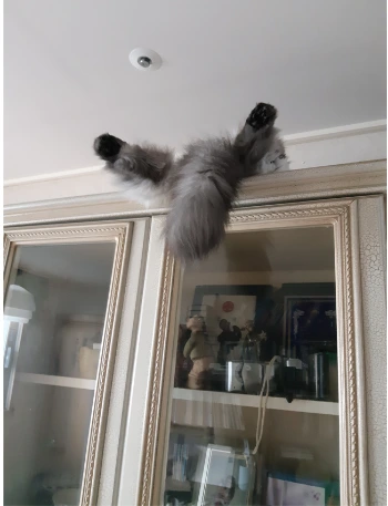 호다닥 달아나 장식장 위로 몸을 숨긴다.