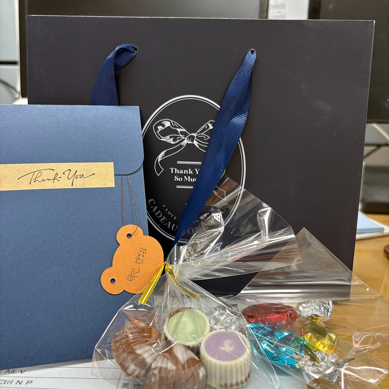 조회시간 반으로 들어가는 길에 슬쩍 창문으로 엿보니 칠판에는 아무것도 없다. 내심 안도하며 교실로 들어가 평소처럼 아침조회를 하고 교무실로 돌아왔는데, 마침 교무실 안에 있던 한 아이가 불쑥 편지와 간식이 든 종이가방을 건넨다. (내거야??!!)