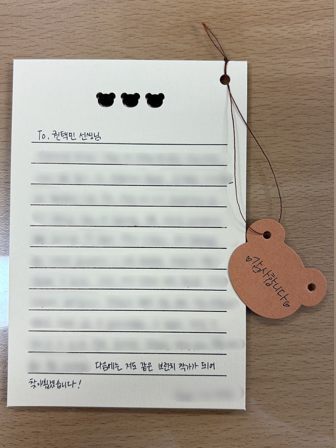 사실 이 날은 오후 수업이 없어 조퇴를 쓴 날이었다. 요 근래 체력이 급격히 떨어져서 잠깐 병원에 들렀다가 종례시간에 맞춰 돌아가려고 했는데, 복귀가 늦는 바람에 소문으로만 듣던 롤링페이퍼는 받지 못했다. 아이들에게는 이것도 하나의 돌발상황이었을지도! 결국 하루 늦게 편지를 받았지만 이미 그 마음은 전해질만큼 전해졌고 덕분에 하루 종일 행복했으니 충분히 훌륭한 이벤트였다❤