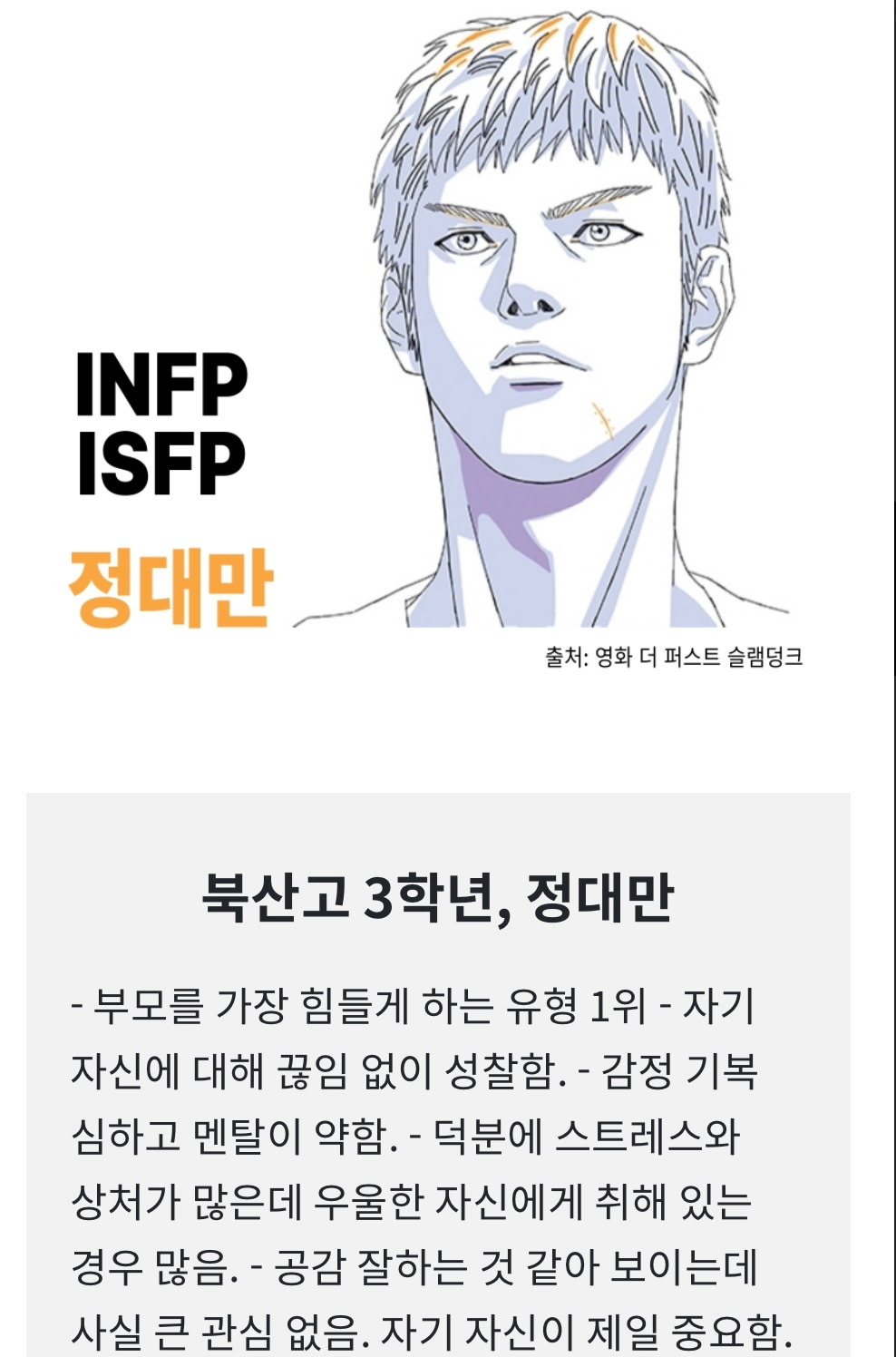 며칠 전, 뻘짓 프로젝트를 함께 하는 분을 통해서 요즘 유행하는 슬램덩크 인물 성격유형테스트. 테스트 결과, 나는 ‘정대만’과 비슷한 성격유형이라고 나왔다. 비슷한 MBTI는 infp , isfp로 유추된다. 이 유형은 부모님이 제일 힘들어할 성격유형이라고 하는 말에 웃음이 나왔다. 감정기복이 심하고 멘털이 약함, 자기 성찰을 잘하는 스타일이라고 하는데, 너무 나 같아서 당황스러웠다.