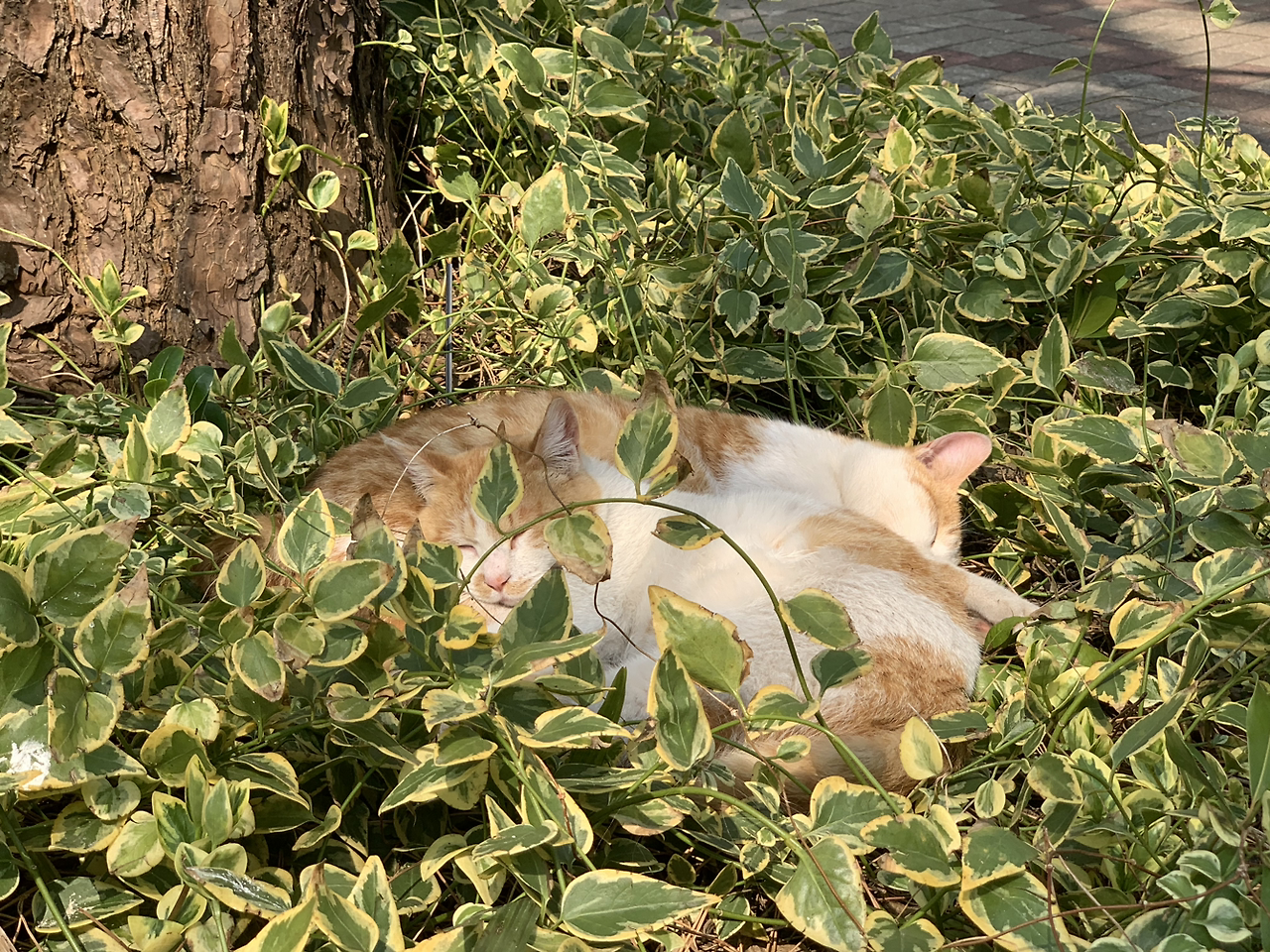 고양이를 유난히 좋아하는 우리 가족은 고양이와 가까운 테이블에 앉아서 가만히 지켜보기도 하고 고양이가 세수하득 얼굴을 그루밍하는 모습을 감탄스럽게 바라보기도 했다. 따사로운 봄 햇살 아래, 느긋하게 서로를 기대어 자고 있던 고양이 두 마리는 평화 그 자체였다. 돌고 돌아 정원 근처에서 잉어와 새끼잉어들을 보며 꺄르륵 대고 왠지 섬칫했던 노란 뱀과 타조에게는 조금 거리를 두기도 했지만 즐거운 시간이었다.