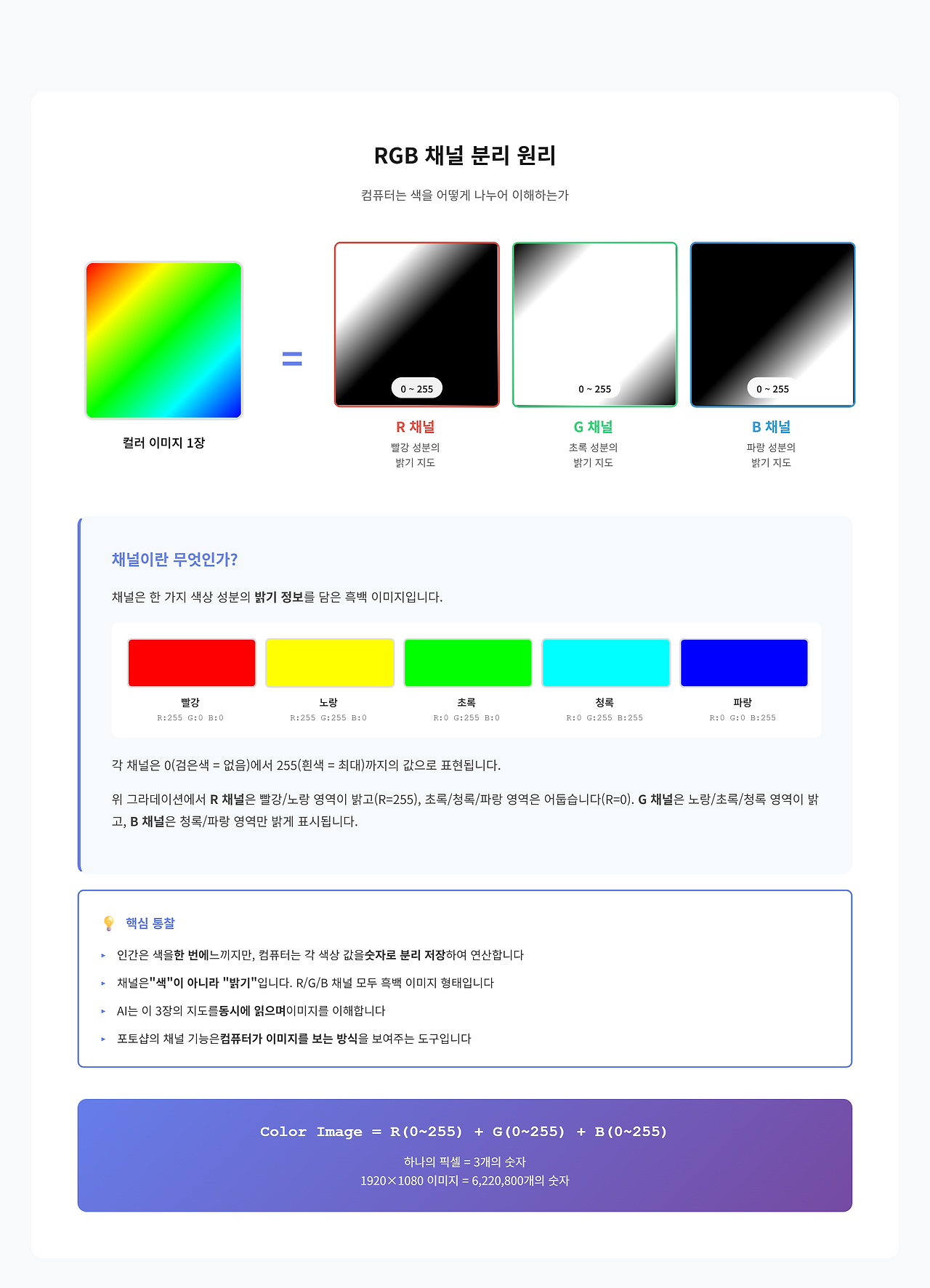 핵심은 이거다. 인간은 색을 한 번에 느끼지만, 컴퓨터는 각 색상 값을 숫자로 분리 저장하여 연산한다.