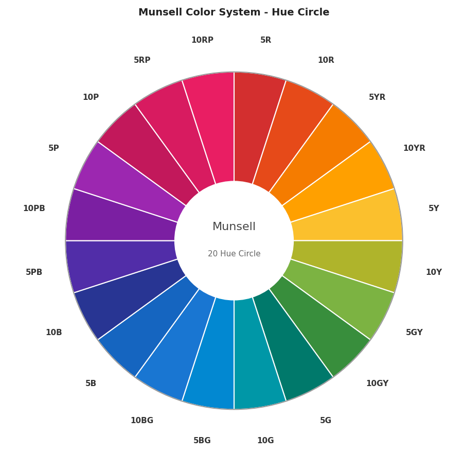 20세기 초 먼셀(Munsell)이라는 화가가 교육용으로 고안한 이 색 체계는 색상(H), 명도(V), 채도(C)를 20가지 색으로 분류했다. 해당 색은 인간이 느끼는 직감을 기준으로 체계적으로 정리되어 있다.