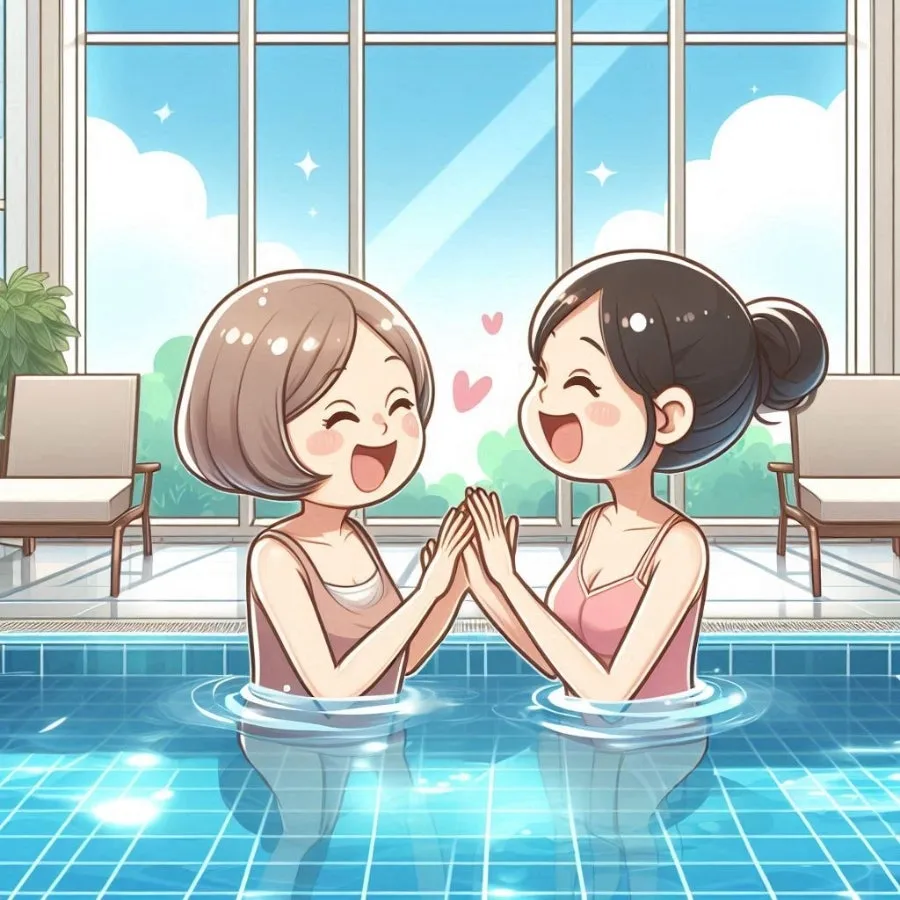 이 얼마나 좋은가. 파란수영장이 기쁨으로 가득 찬다. 역시 혼자보다는 '함께'가 좋다. 그렇게나 넓어보이던 레인이 이젠 아니다. 언니와 필이의 행복으로 가득해진다. 좋은 것은 그대로 표현된다. 콩콩 뛰는 게 아니라 춤이라도 추듯 흐느적흐느적이다. 필이 몸이 신난다고 저절로 춤을 춘다. 언니도 신나는 듯 힘차게 자전거 페달을 밟는다. 여전히 하체는 운동 중이고 상체는 논다. 재밌다.
