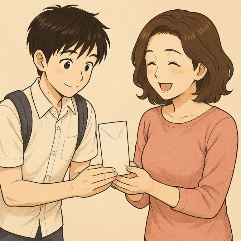 편지 봉투를 두 손으로 잡고 엄마에게 내미는 시늉을 한다.