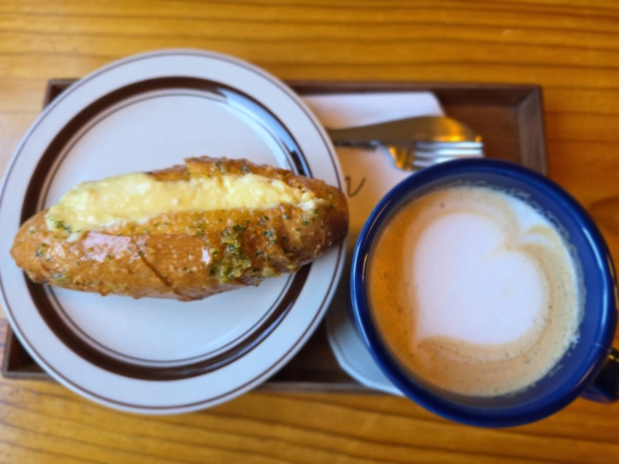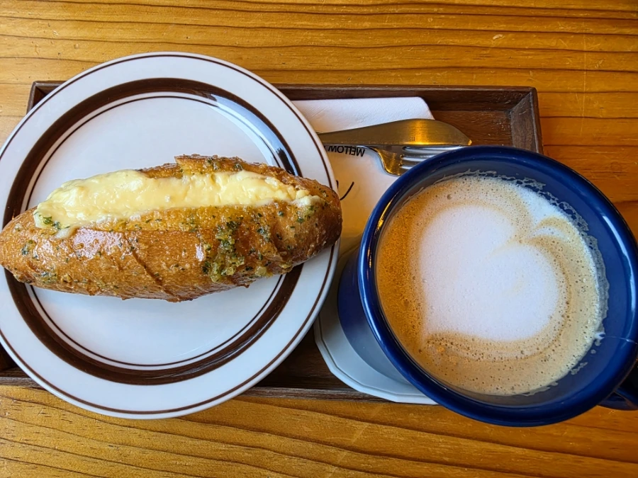 사장님이 "작가님이세요?"라며 놀랍니다. 그리고 너무 좋아합니다. 선물 드리길 잘했다 생각하며 평소 시키던 연유라떼를 주문하고 자리에 앉습니다. 책도 꺼내고 노트북도 꺼내고 주섬주섬 챙기고 있는데 사장님이 옵니다. 손에는 제가 시킨 연유라떼와 제가 시키지 않은 치즈바게트와 함께!