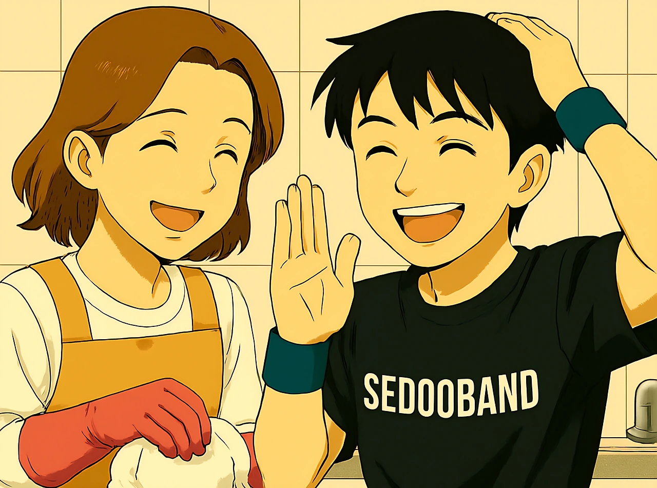 고무장갑을 벗은 손으로 아이의 손목 보호대를 잡으려고 한다. 자세히 보기 위함이다. 바로 그때!
