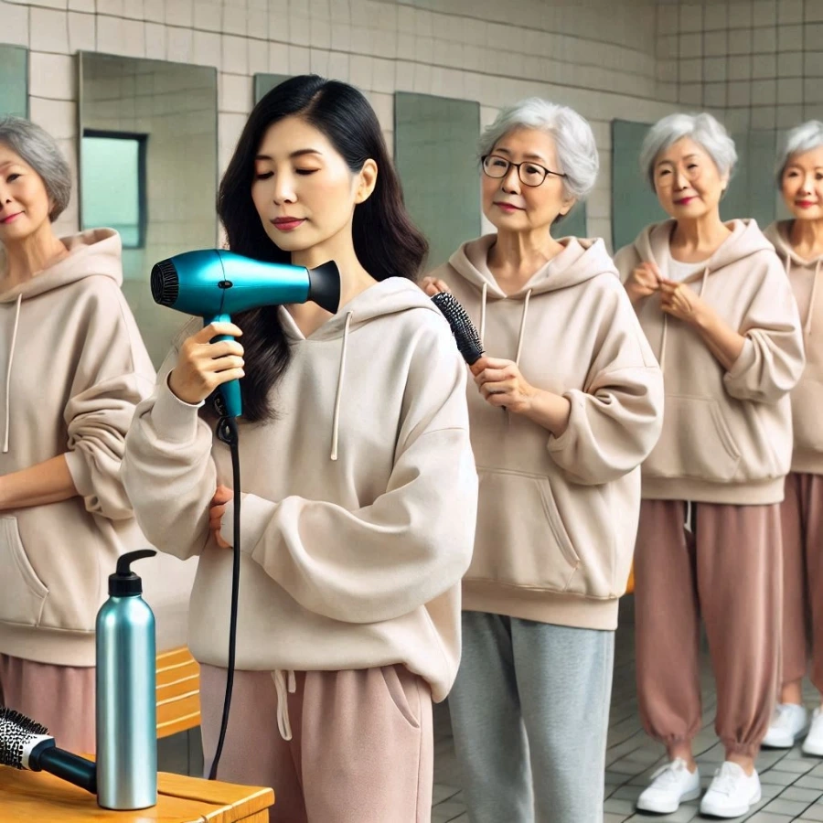 "지금 줄을 선 거예요? 머리 말리려고요? 저 분은 계속 드라이를 하고 있고요?"