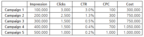 해당 클릭당 비용(CPC)을 클릭 수와 곱하면 총 비용(Cost)이 나옵니다.