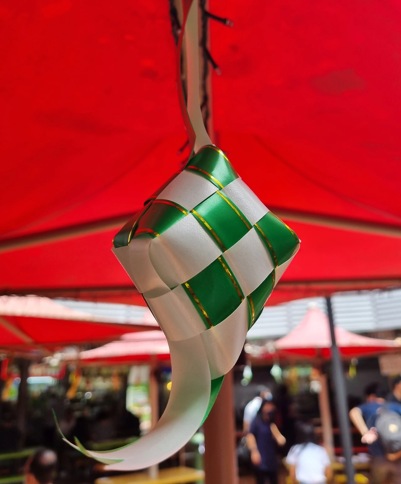 물어보니 말레이시아 전통 음식인 ‘끄뚜빳’(Ketupat)이라고 했다. 어린 야자잎을 교차해 엮어 만든 특이한 모양의 주머니에 쌀이나 찹쌀을 넣어 찐 음식인데, 이걸 모형으로 달아 놓는 것이다. 한 달간의 금식으로 자신의 죄를 속죄한 이슬람 신자들의 신앙적 승리를 표현하는 거라고 했다.