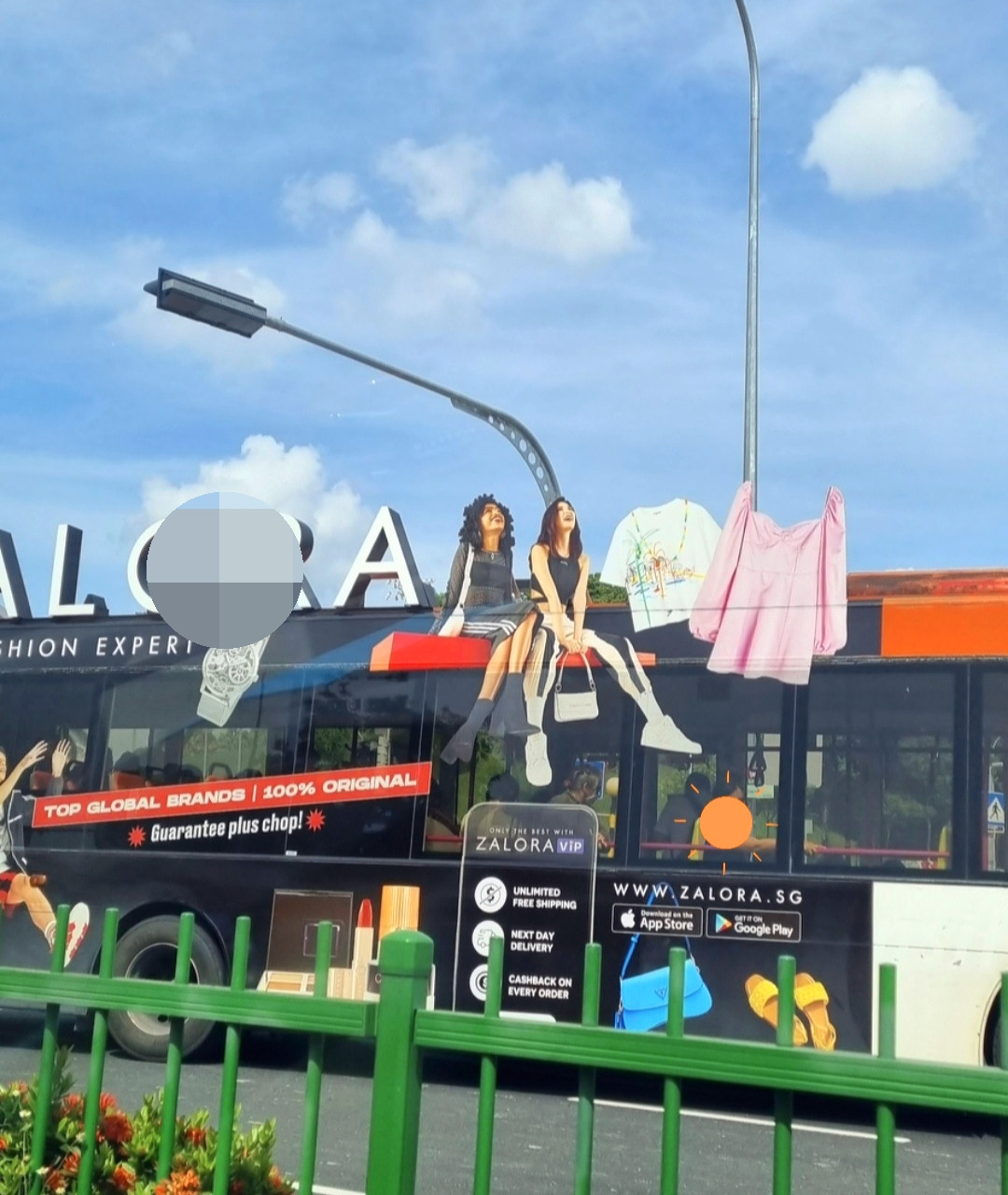 " 사람들이 버스 위에 앉아 있는 거야? 뭘 광고하는 거지? "