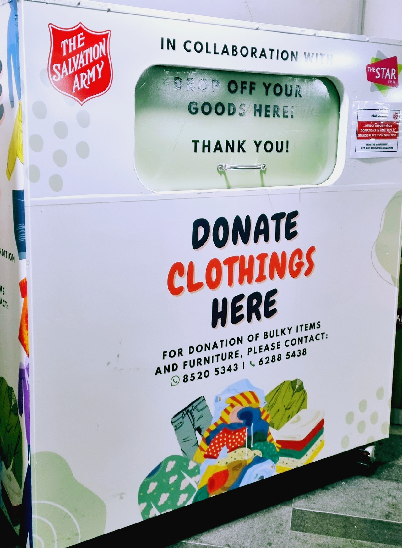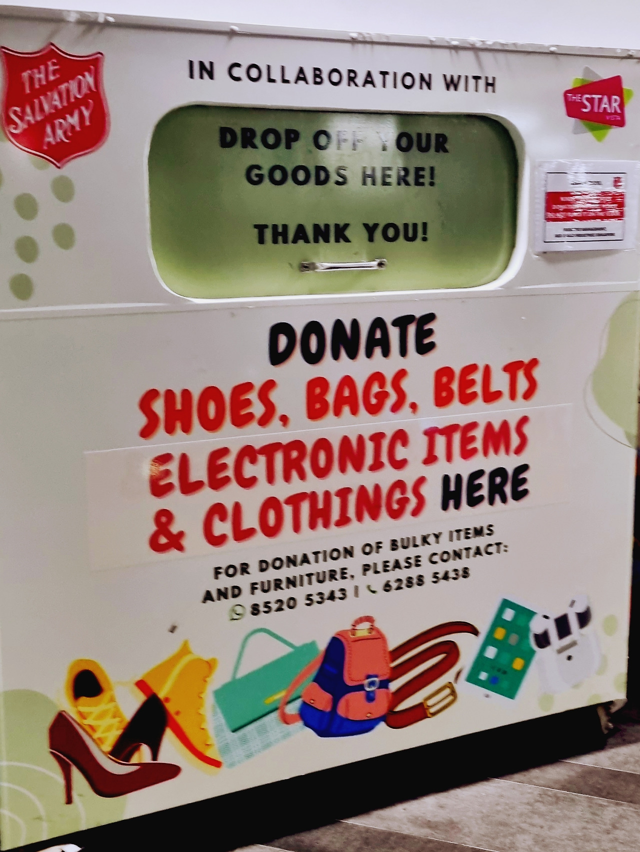 참고로 버리기 아까운 물건을 나누고 싶다면 싱가포르 내 일부 쇼핑몰에는 나눔을 위한 수거함이 마련되어 있다. 나눔 하고 싶은 물건이 있다면 이 통에 넣어두면 된다.