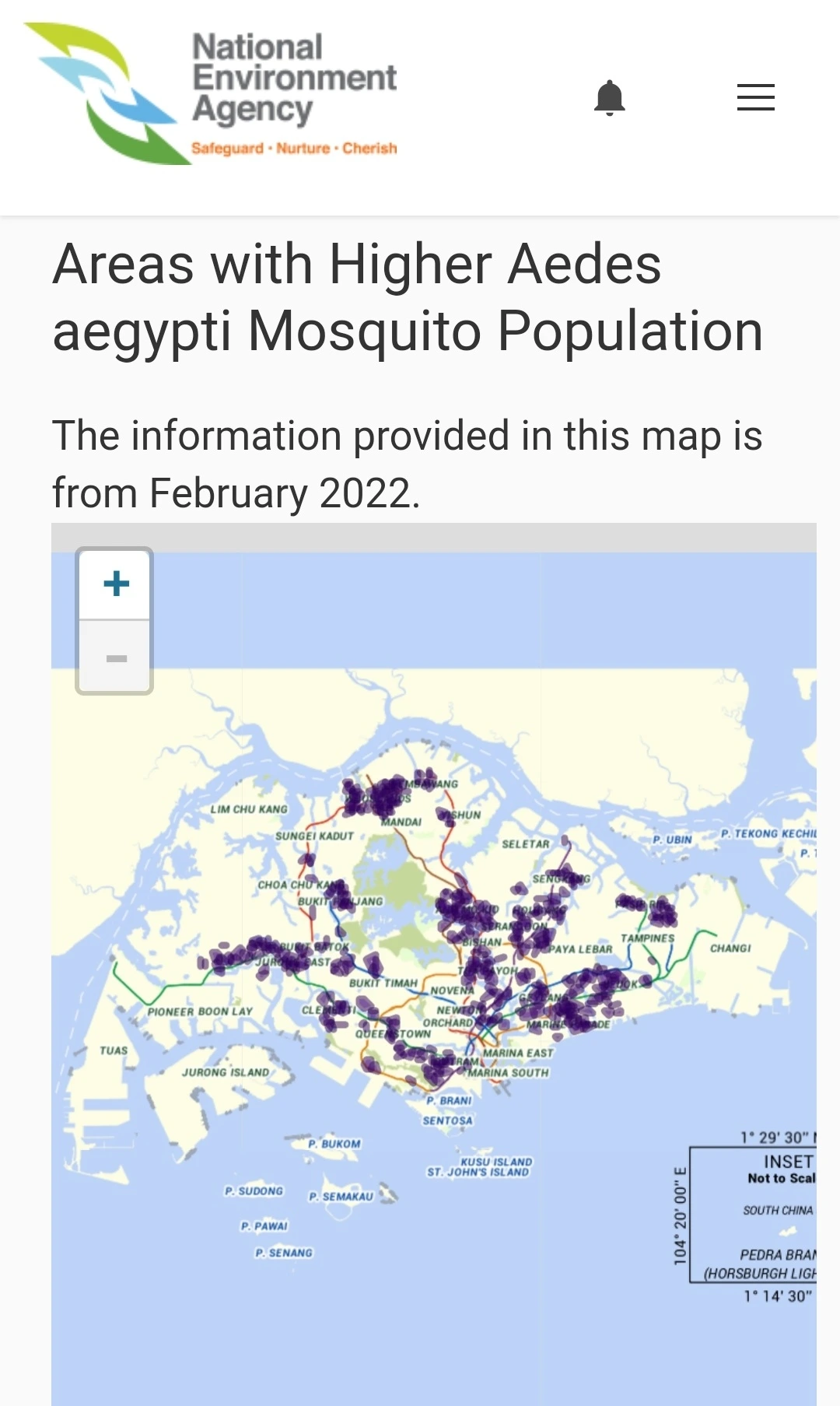참고로 싱가포르 NEA 사이트에 들어가면 뎅기모기 위험 지역이나 감염자 수를 확인할수 있다. 거리에도 지역별 위험 정도를 색깔로 구분해 현수막을 걸어 표시해준다. Green은 안전한 지역이고, 10 case 미만 지역은 Yellow, 그 이상의 위험 지역은 Red로 표시해 경고하고 있다.