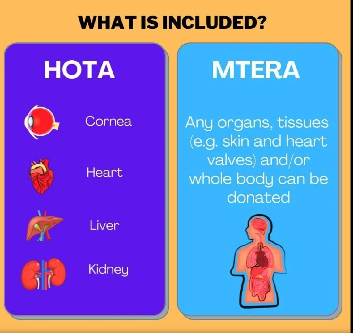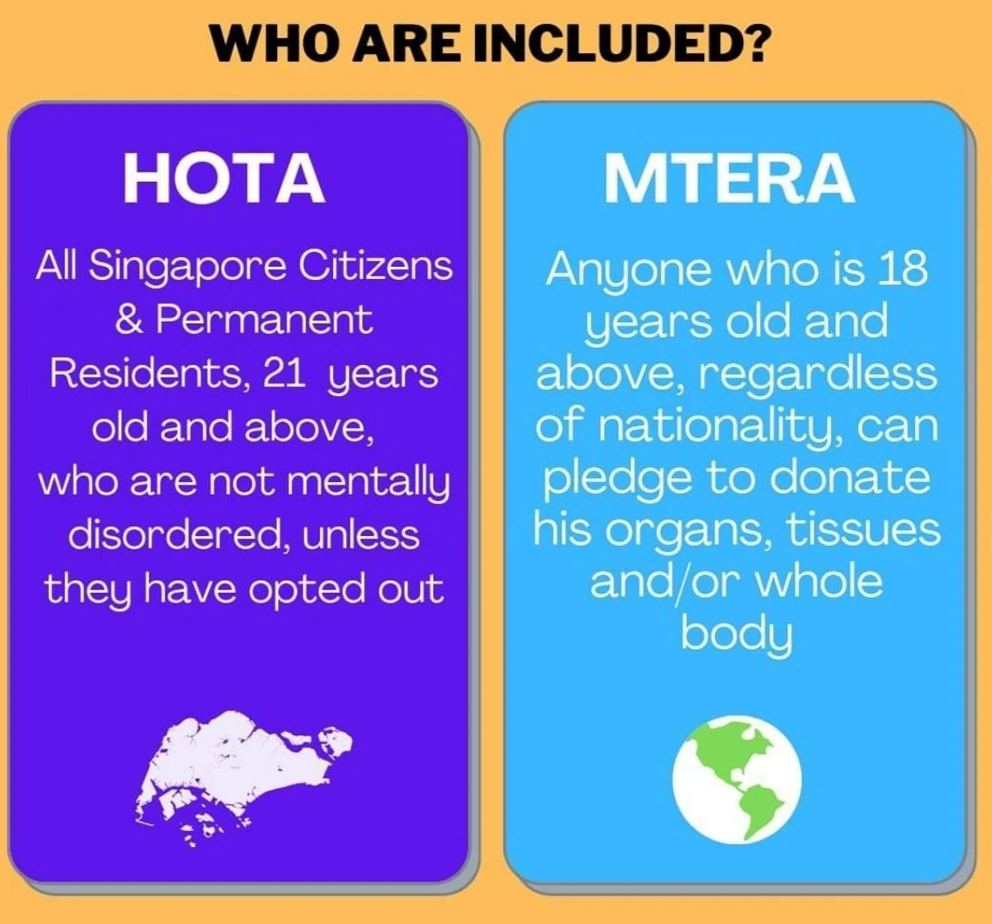1974년에 제정된 MTERA는 HOTA와 달리 의무가 아니라 자발적 결정이며, 국적에 관계없이 18세 이상 싱가포르에 거주하는 모든 개인에게 개방되어 있다고 한다. MTERA에서는 연구, 의료 또는 치과 교육을 목적으로 병원이나 교육기관에 신체의 전부 또는 일부를 기증하거나, 장기 기증이 필요한 사람에게 장기를 기증하는 것을 선택할 수 있단다.