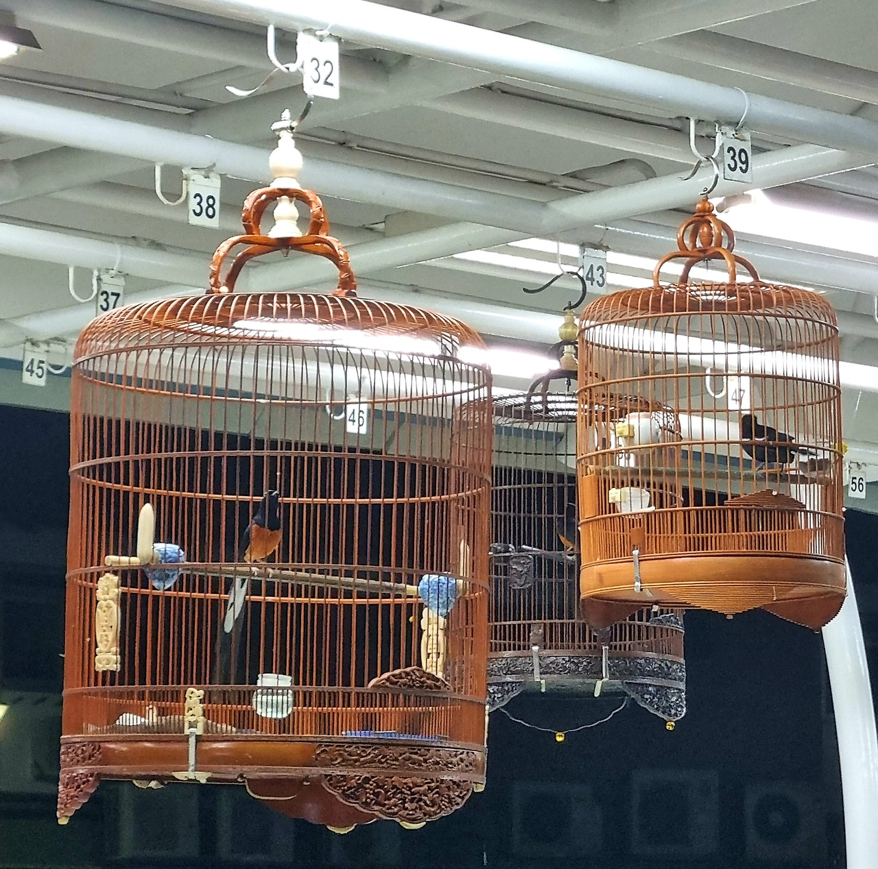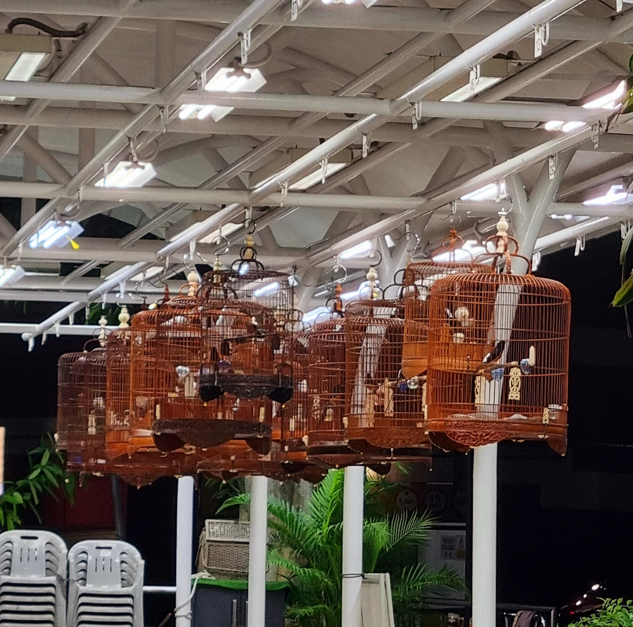 환한 불빛 아래 수많은 새장이 걸려있었고 새들이 열심히 노래하고 있었다. 이 시간에 이러면 누가 항의하지 않나 싶을 정도로 새들의 노랫소리는 컸다. 새장이 걸린 곳 아래쪽으로는 앉아서 들을 수 있게 의자가 놓여 있었다. 새 주인인지 몇 분의 남자분들이 앉아서 새소리를 듣고 계셨다.