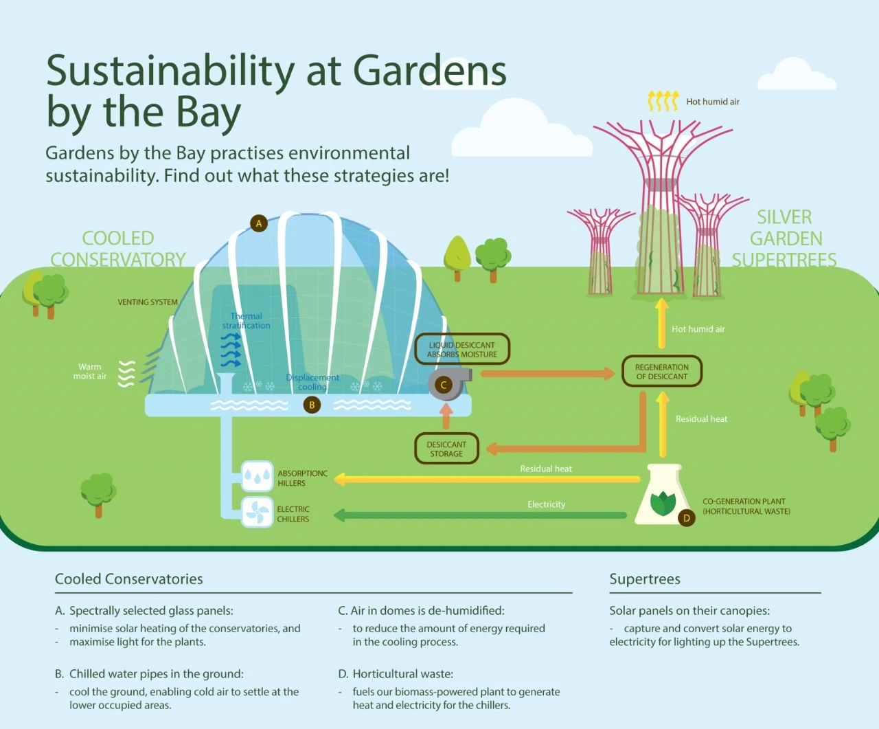 가든즈 바이 더 베이에는 클라우스 포레스트 (Cloud Forest)와 플라워 돔 (Flower Dome)이란 두 개의 유리 온실과 슈퍼트리 그로브 (Supertree Grove)가 있다. 이 정원을 지을 때부터 에너지와 물의 지속 가능한 사이클을 계획하고 설계해서 친환경적인 공간을 만들고자 한 노력이 빛나는 곳이다.