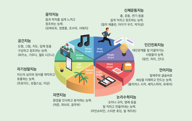 미국의 심리학자이자 하버드대 교육대학원 교수인 하워드 가드너는 '인간의 지능은 총 8가지로 구성된다'는 '다중지능'이론을 주장했다.