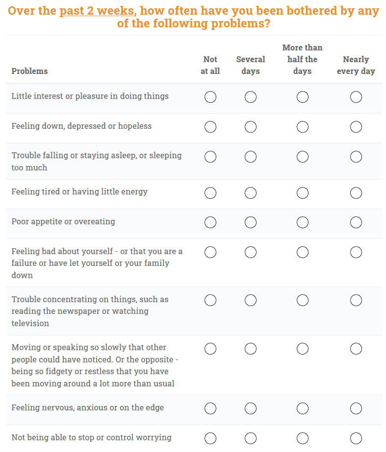 아래의 우울과 불안의 정도를 묻는 모든 문항에 '거의 매일 (Nearly every day)'를 선택하고 있었다.