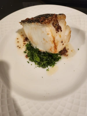전통적인 뫼니에르 방식이 아닌 버터와 생선껍질을 사용하여 바삭함과 부드러움을 동시에 표현하고 싶었다. 일단 껍질을 아보카도 오일에 튀기듯 구웠다. 팬을 불에서 잠깐 옮기고 소심하게 버터를 넣고(버터는 비싸니까!) 다시 불에 옮기는 과정을 여러 번 반복했다. 두께가 있어 ‘부드러울까? 너무 익혀 뻑뻑하면 어떡하지? 요 껍질은 바삭하고 고소할까?’ 이런 궁금증으로 더욱 온도 상승에 신경을 곤두세웠다. 다 익은 생선을 놓은 후, 마지막으로 홀그레인 머스터드와 버터 소스를 섞은 후 끼얹었지.