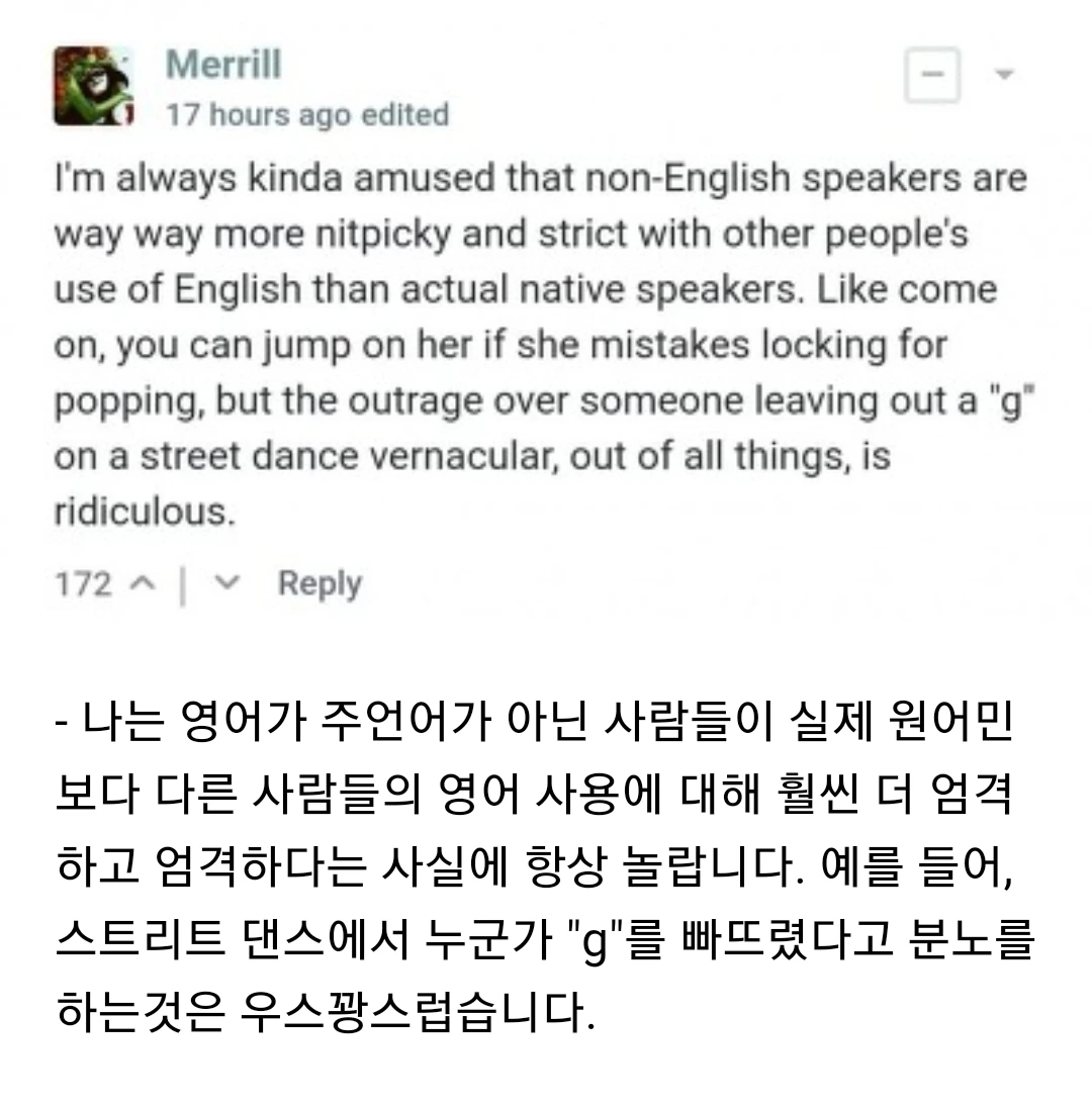 G를 생략하는 것은 구어체적인 표현으로 의미에는 아무 차이가 없으며, 해외의 댄서나 해외팬들 모두 똑같은 두 단어를 가지고 왜 싸우냐는 반응을 보였다. 영어 단어를 가지고 한국인들이 어이없게 싸운다는 자체에 황당함을 나타내고 있다.