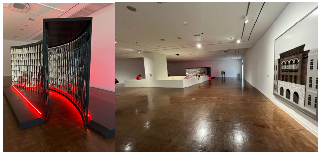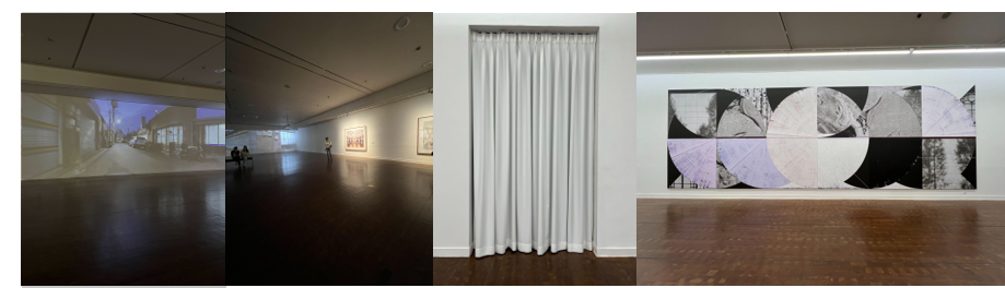 좌) 서도호의 영상설치, 실내조명 및 전경 / 우) 전시관 사이의 통로 커튼 가림막, 이희준의 대형 회화 작업