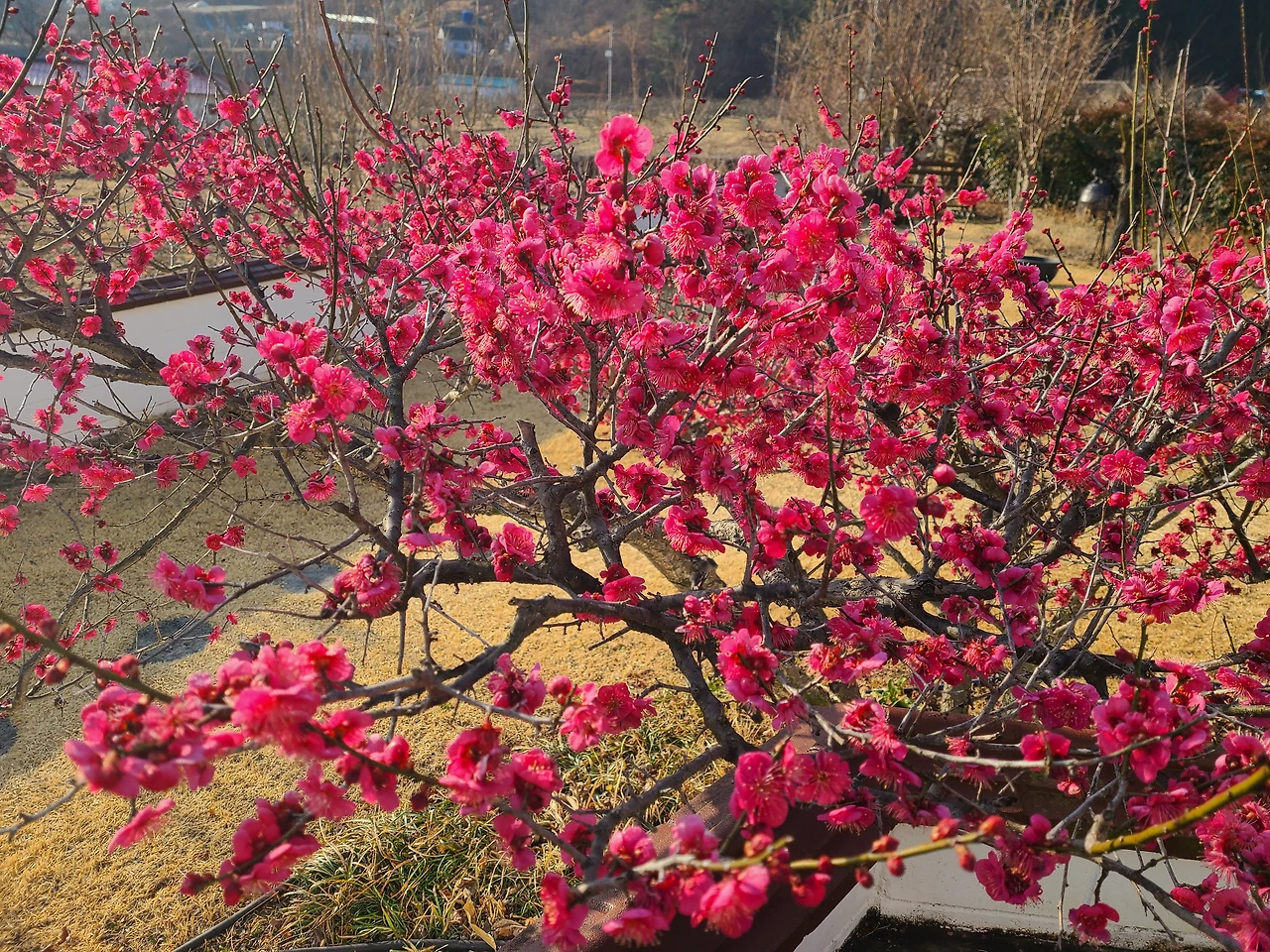 아침에 떠오른 해를 보며 홍매화를 배경으로 삼일절노래를 불렀다. 가슴 벅차다!