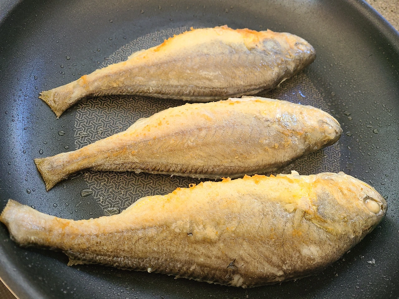 생선을 구웠다. 올케언니가 선물해 준 여섯 마리 중에 세 마리는 벌써 먹었고 냉동고에 두었던 부세조기 세 마리를 해동시켜 구우면서 영상으로 담았더니 생선 굽는 소리가 쏟아지는 빗소리처럼 들린다.