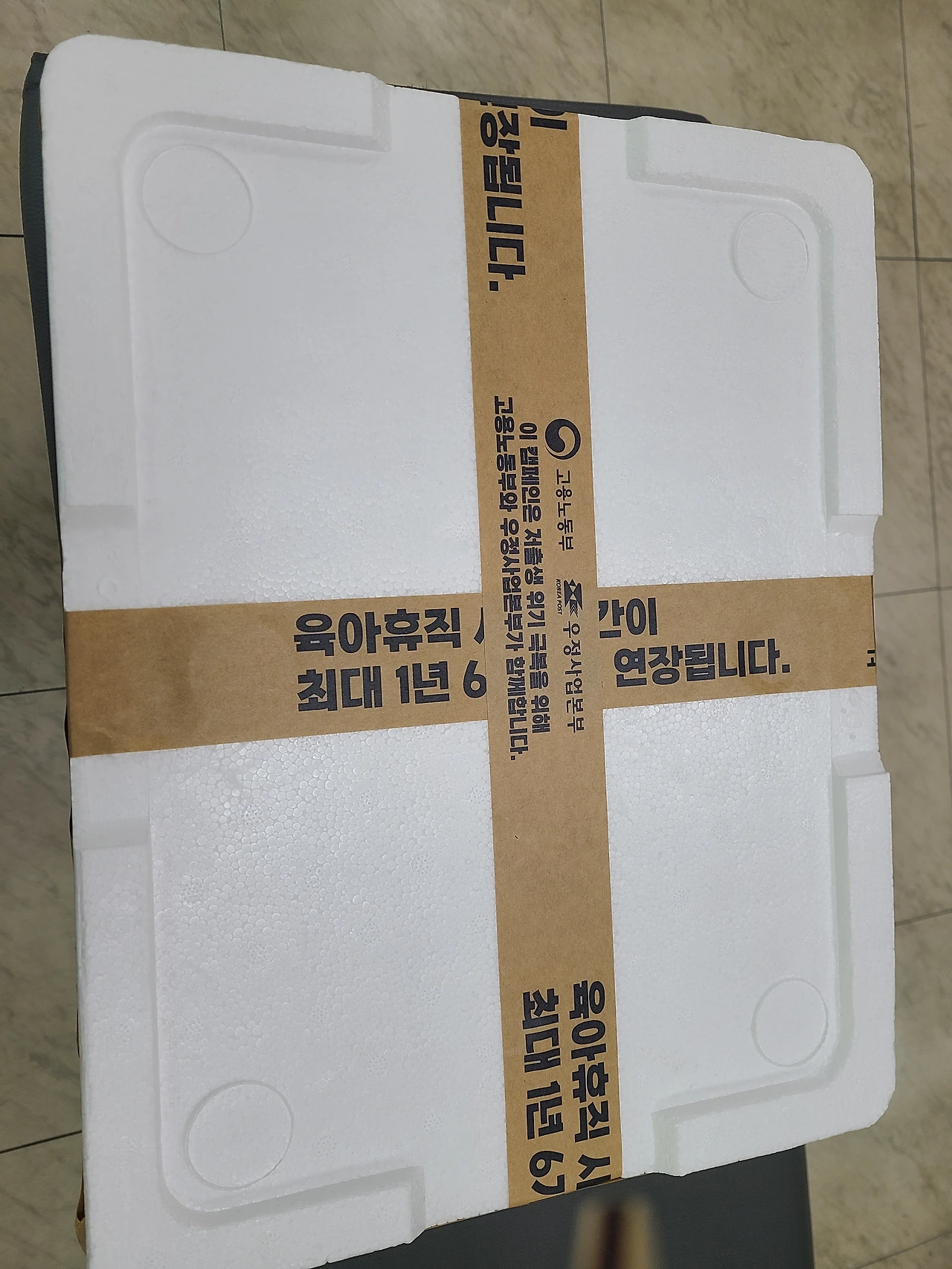 택배포장을 하기 위해 준비되어 있는 테이프 두 개 중에 하나는 선전문구가 있다. 육아휴직 사용기간이 최대 1년 6개월로 연장되는데 저출산극복을 위해 고용노동부와 우체국이 함께 캠페인을 하고 있단다.