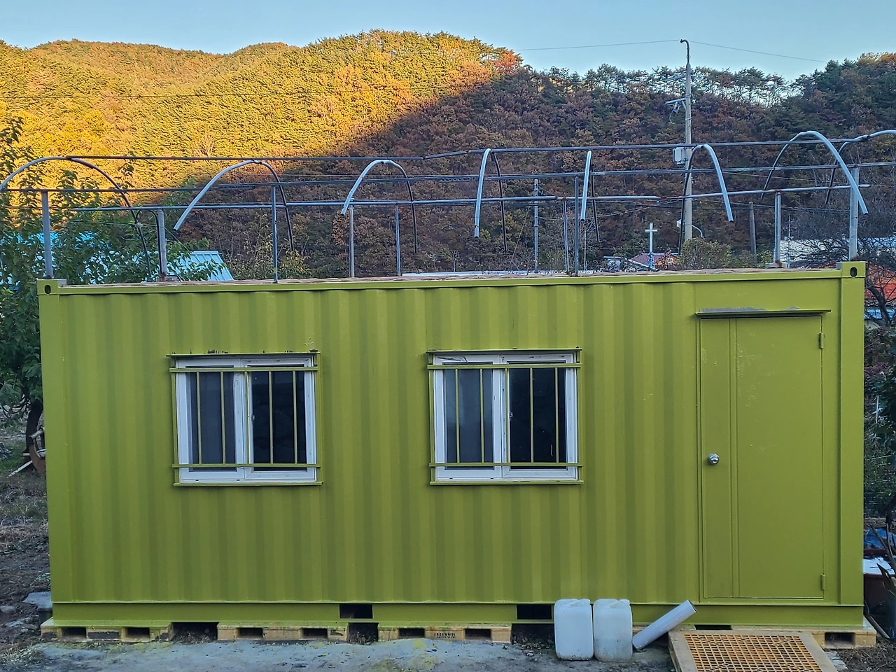 담장너머 과수원에 놓여있는 컨테이너가 색을 입었다. 중고를 구입해서 몇 년을 쓰다 보니 여기저기 칠이 벗겨져 보기가 좋지 않았는데 페인트 칠을 하니 새것처럼 변했다. 진해에 사는 과수원 주인이 컨테이너를 놓은 첫해 여름을 지내고 지붕에 천막을 씌웠는데 다음 해 여름 태풍으로 비닐천막이 날아가서 지붕에는 앙상한 뼈대만 남았다.