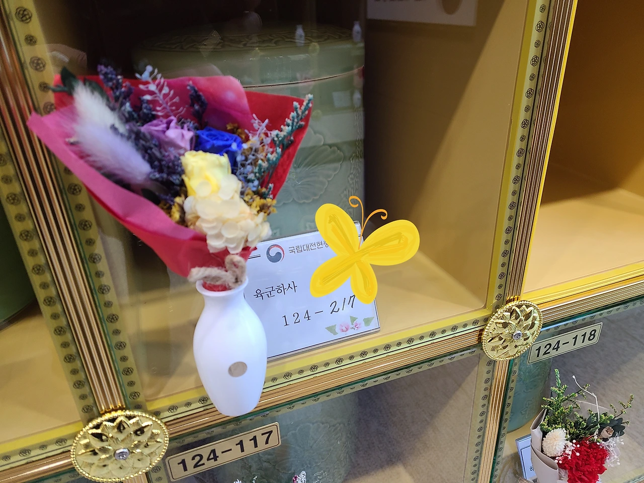 현충원에서 치르진 행사는 가슴을 울렁이게 한다. 엄숙하고 경건한 식을 마치고 봉헌당으로 유골함을 가져가서 124-217 자리에 놓았다. 조카는 우리 아버지, 가족들이 편하게 조문하라고 위쪽이 아닌 아래쪽에 자리를 잡았네요~라고 한다. 봉헌함 앞에 자그마한 화병이 있기에 매점에서 꽃을 사 와서 화병에 꽂았다. 화려한 꽃이다.