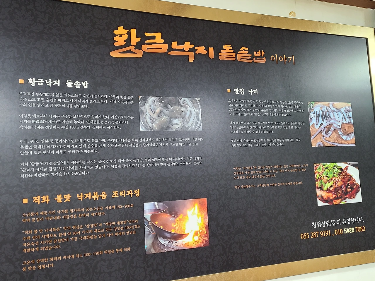 중국산동성해안(우리나라의 서해안)에서 잡은 낙지를 급랭 시킨 것을 사용하여 산 낙지와 손색없는 신선도와 쫄깃한 맛을 느낄 수 있고 칼집을 내어 직화로 조리하고 있단다. 낙지볶음 한 접시는 많은 시행착오와 노력의 결과이며 앞으로 더 나은 황금 낚지 돌솥밥을 만들기 위한 노력을 멈추지 않을 것이란다. 스토리텔링이다.