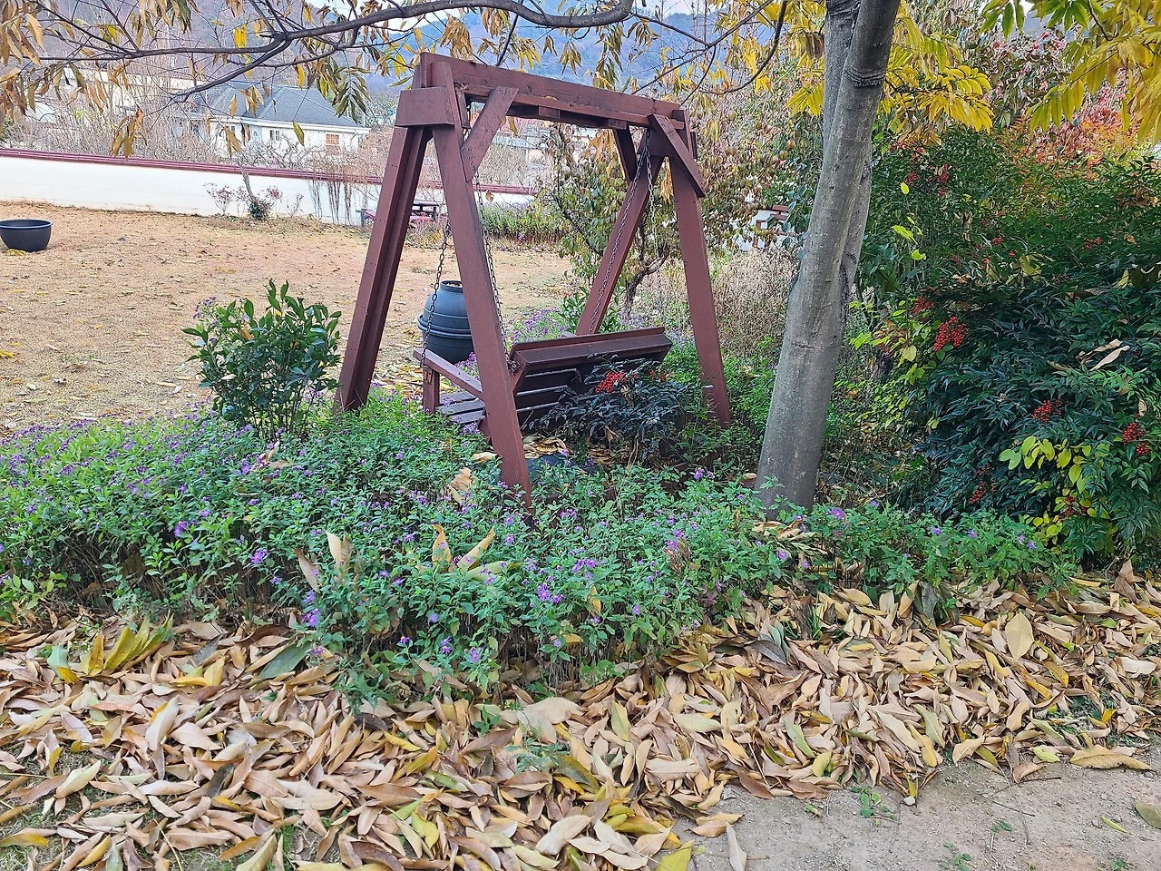 모감주나무가 서둘러 잎을 떨어뜨렸다. 뒤쪽의 나무는 가지가 앙상하고 햇빛을 듬뿍 받는 앞쪽 나무는 노란 잎을 달고 있다. 그네 옆에 쌓인 낙엽을 그대로 두었다가 나무가 잎을 모두 떨어뜨리면 쓸어 담을 예정이다. 결과를 알면 삶이 느긋해진다.