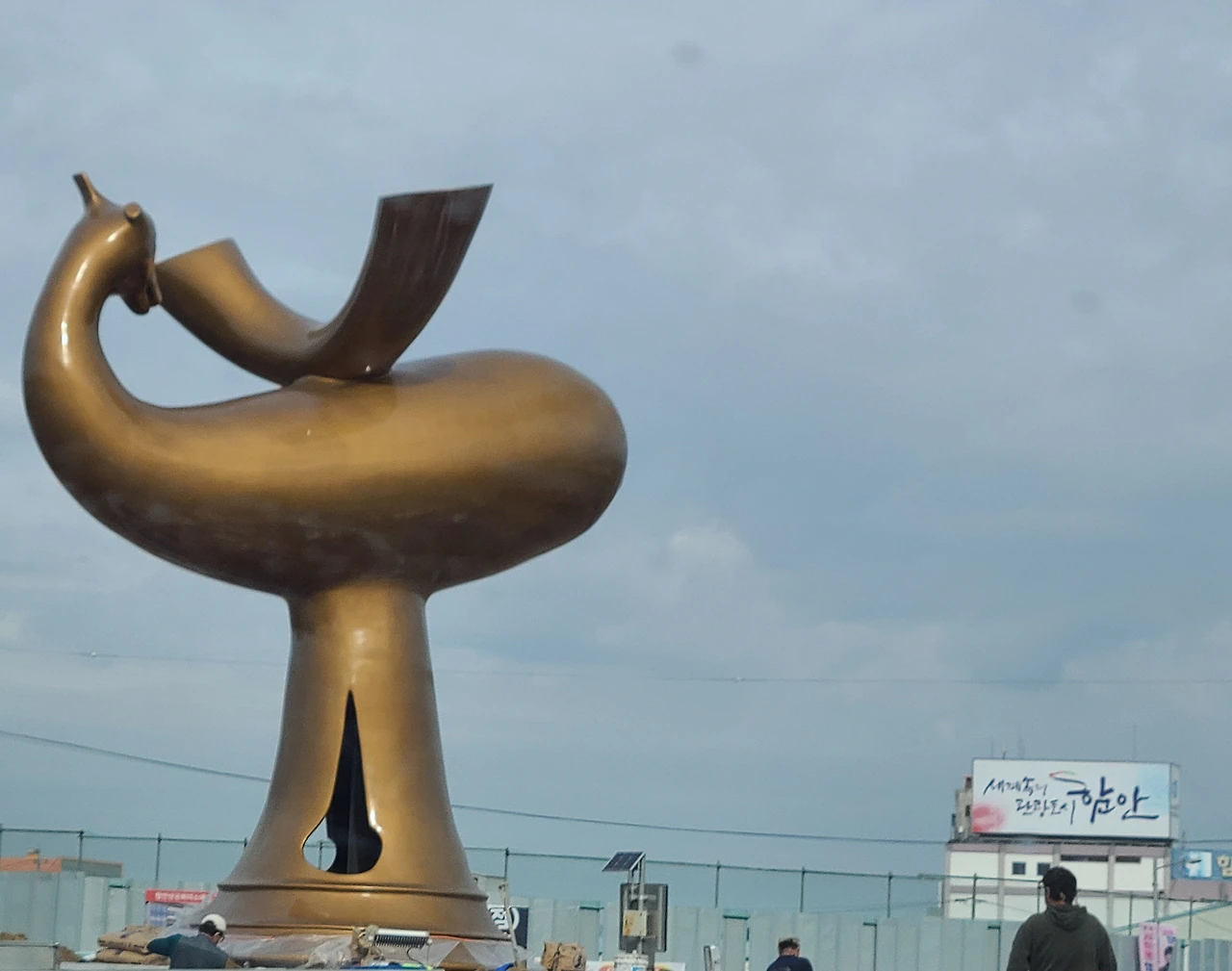 아침에 함안에서 목욕을 마치고 차를 타고 고속도로 쪽으로 오다가 로터리에서 상징탑 공사를 하고 있는 이들을 만났다. 가야읍과 법수면 가는 길로 나뉘는 곳에 신호등이 있었는데 어느 날 로터리가 들어서더니 한가운데 상징물을 세우는 작업을 한다.